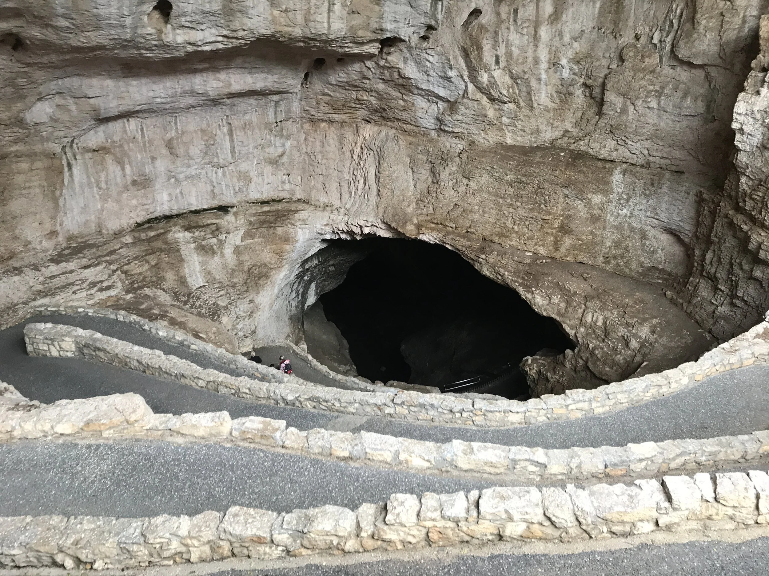 So the new plan went off without a hitch, and we were at the caverns 30 minutes after they opened to get a prime parking spot. On the way up, traffic had to stop for a few minutes to allow some animals to cross the road (pic below) which was neat to see. Once we got there, we signed up for the audio tour and took the advice we saw online to start at the natural entrance and then take the elevator out (yes..elevators! We live in fantastic times). The trail from the natural entrance is 1.2 miles long and descends about 750 feet so hoofing it out of there uphill the other way is no picnic.