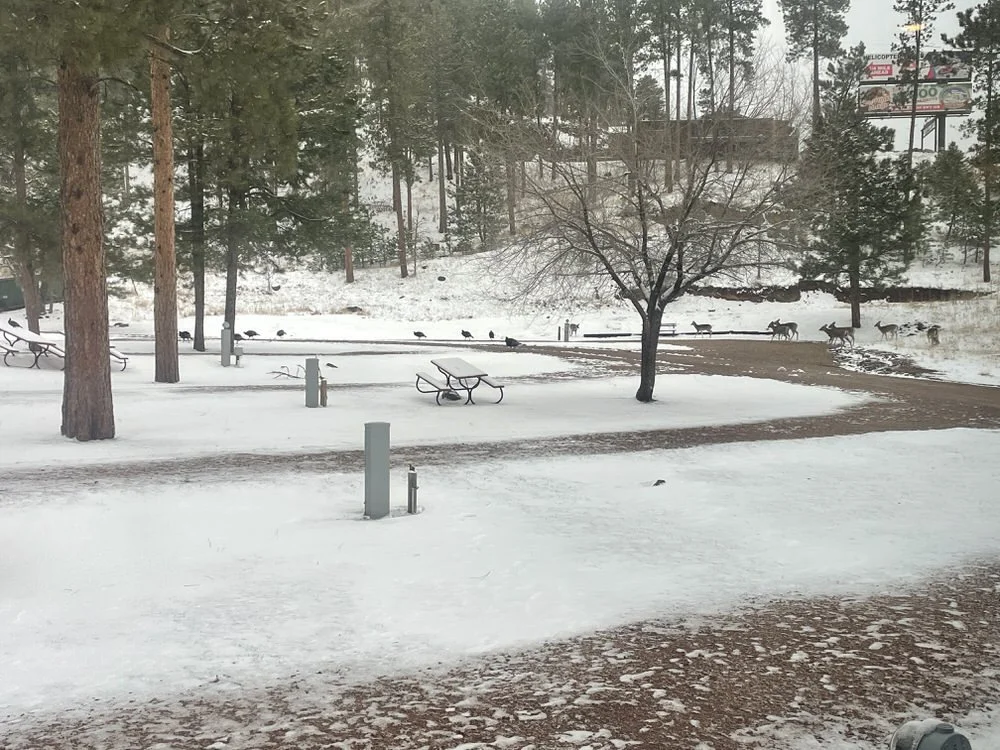 We headed to bed and planned on hitting the road to Wall, South Dakota, in the morning. Mother nature had a different plan for us. We woke up to inches of snow, and more snow and high winds were forecasted. We weren't going anywhere, so we extended our stay. Later in the afternoon, after the snow had melted a little bit, the entertainment came walking through the RV park. By entertainment, I mean the wild turkeys and deer traveling as a pack. It was hilarious to watch them run the RV park together. Who knew turkeys and deer were friends? They came through several times during our stay.