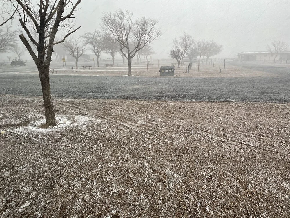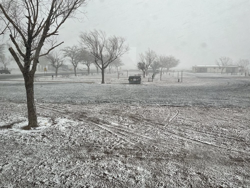 By the next morning, it had stopped snowing but there was still snow on everything. I checked the NPS website and there was an alert that said the park would have a delayed opening. I was excited. A delayed opening works for me I thought, as long as it opens. Now it was time for us to get the RV road-ready. We had to get out our telescoping ladder and Penguin used the dustpan to scrape ice and snow off the slide toppers. Luckily, it came off easily so we were ready to start our adventure to the Petrified Forest.