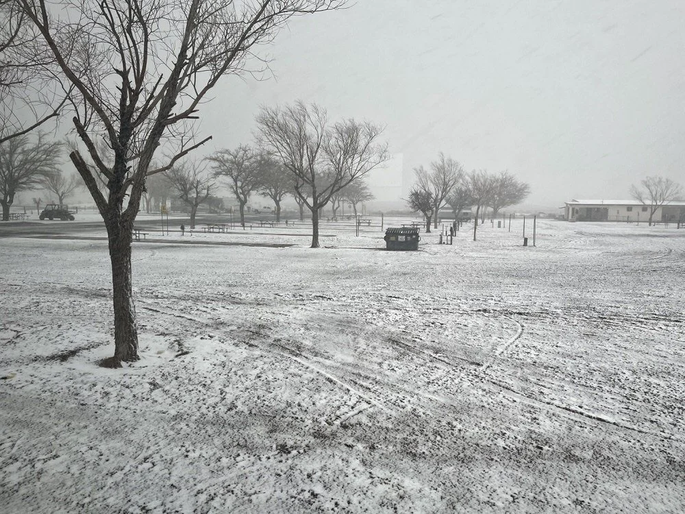 After leaving the Phoenix area, we headed to Holbrook, AZ. I remember driving through this town in 2019 due to all the silly fake dinosaurs they have on the main street. Our plan was to stay one night at OK RV Park in Holbrook, and then head to the Petrified Forest National Park the next day. It was super windy when we arrived and we could tell a storm was coming. By morning on 2/23/2022, it started to snow. From the photos below you can see how quickly everything was covered in a few inches of snow. We decided to wait it out and stay another night. Hopefully, this would give the snow on the roof and slides time to melt.